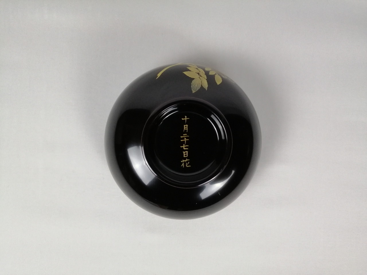 本商品は本金・本漆を使用しており、底面には「十月二十七日花」の文字を絵付けいたします。